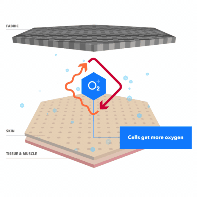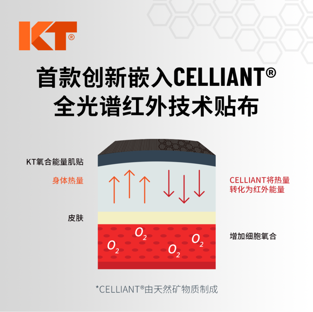 KT OXYGEN 氧合能量肌贴是身体能量的搬运工。身体发出的热量是含有红外波的能量,当我们的身体自然释放热量时,红外波的能量会丢失。CELLIANT® 是将天然、红外线发射矿物的混合物嵌入纤维和纱线中的一种功能性纺织品,可减少红外波的能量流失。